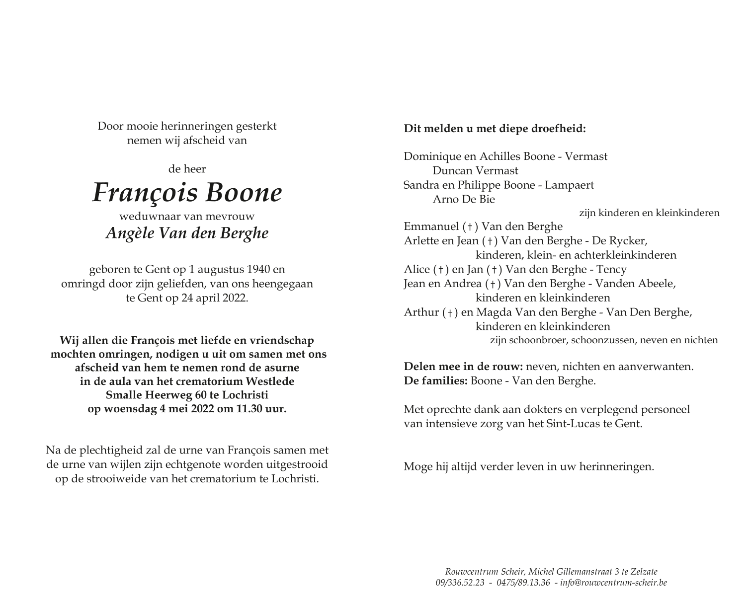 Décédé à Gent (9000) le dimanche 24 avril 2022 à l'âge de 81 ans