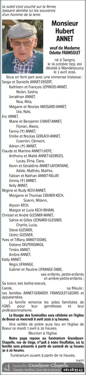Décédé à Wandebourcy (6662) le jeudi 2 avril 2026 à l'âge de 93 ans