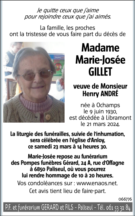 Décédée à Libramont (6800) le jeudi 21 mars 2024 à l'âge de 93 ans