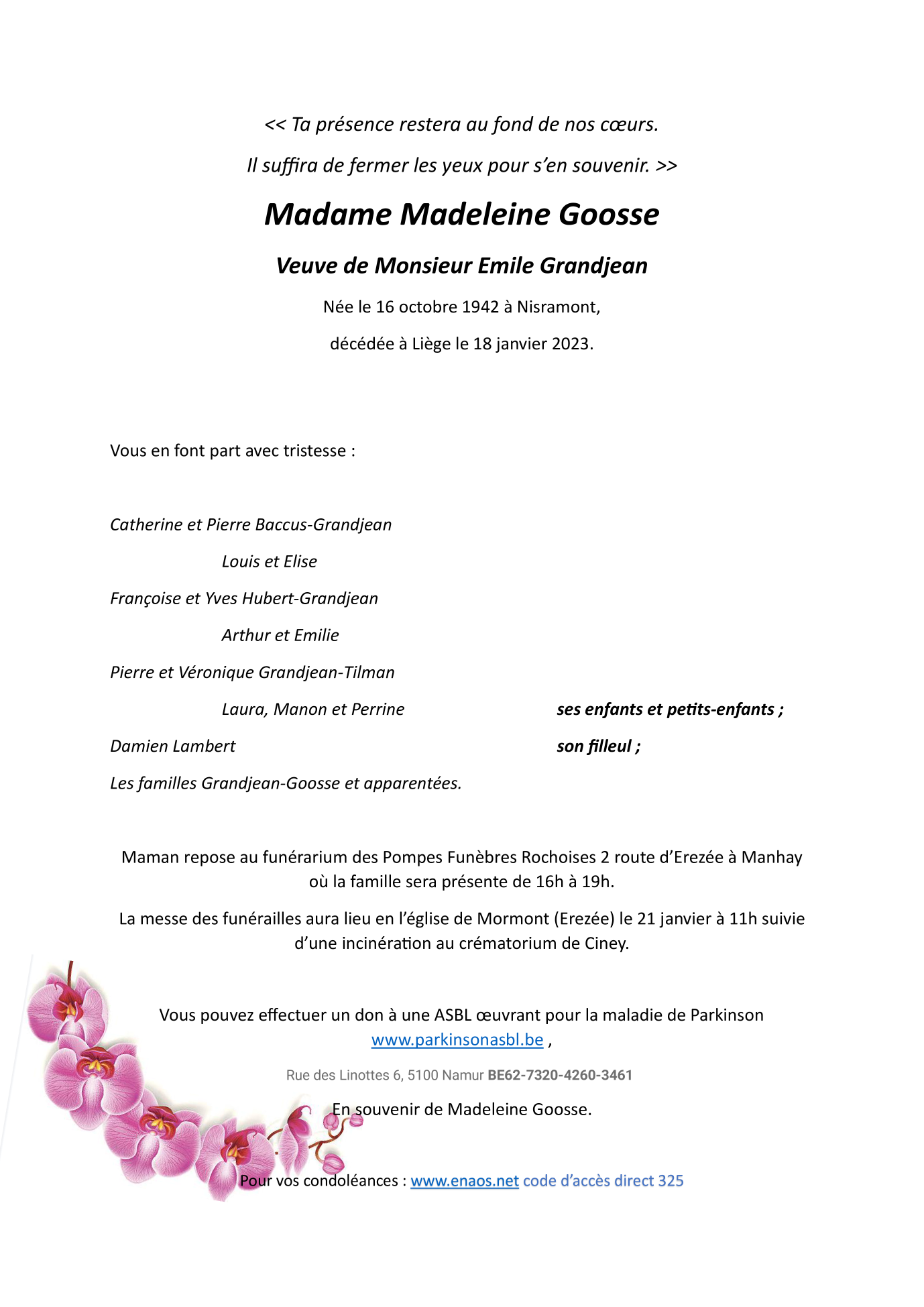 Décédée à Liège (4000) le mercredi 18 janvier 2023 à l'âge de 80 ans