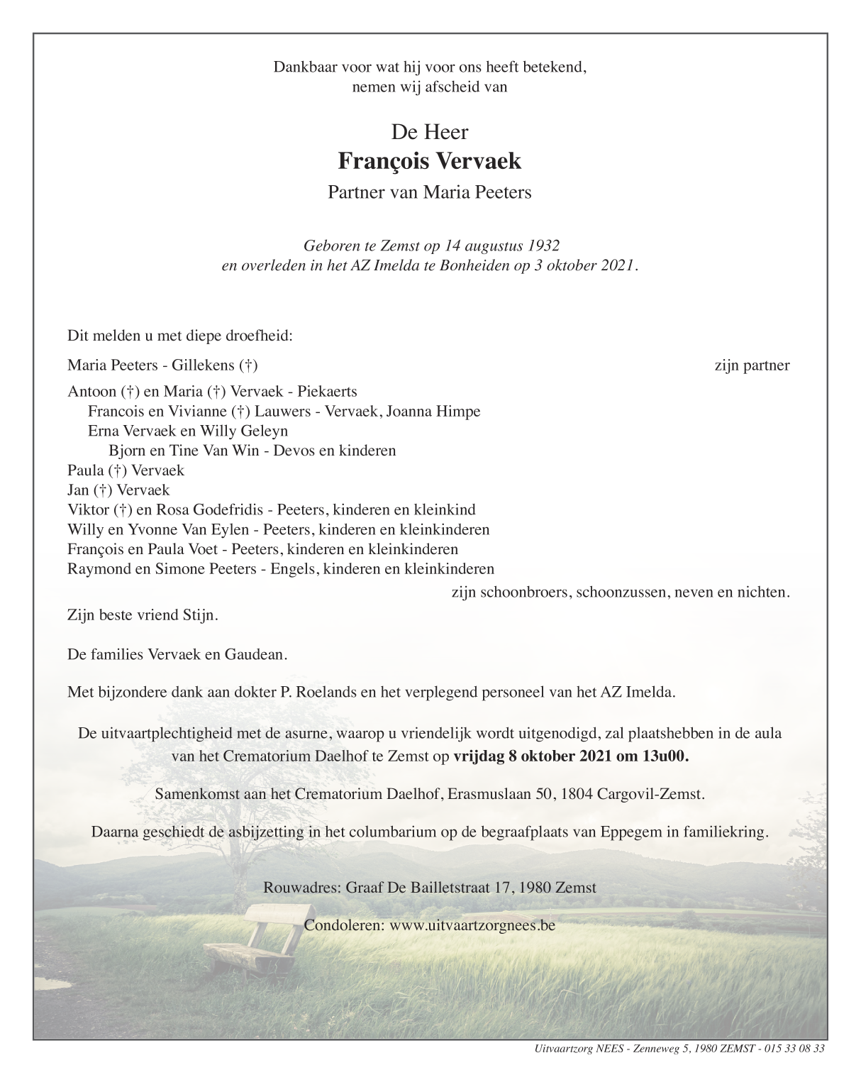 Overleden te Bonheiden (2820) op zondag 3 oktober 2021 op 89-jarige leeftijd