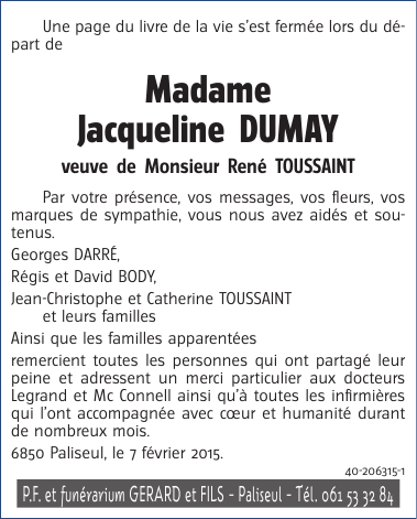 Veuve de Monsieur René TOUSSAINT