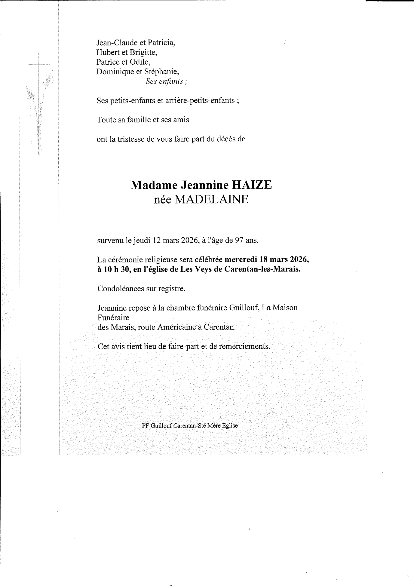Décédée à Carentan-les-Marais (50500, France) le jeudi 12 mars 2026 à l'âge de 97 ans
