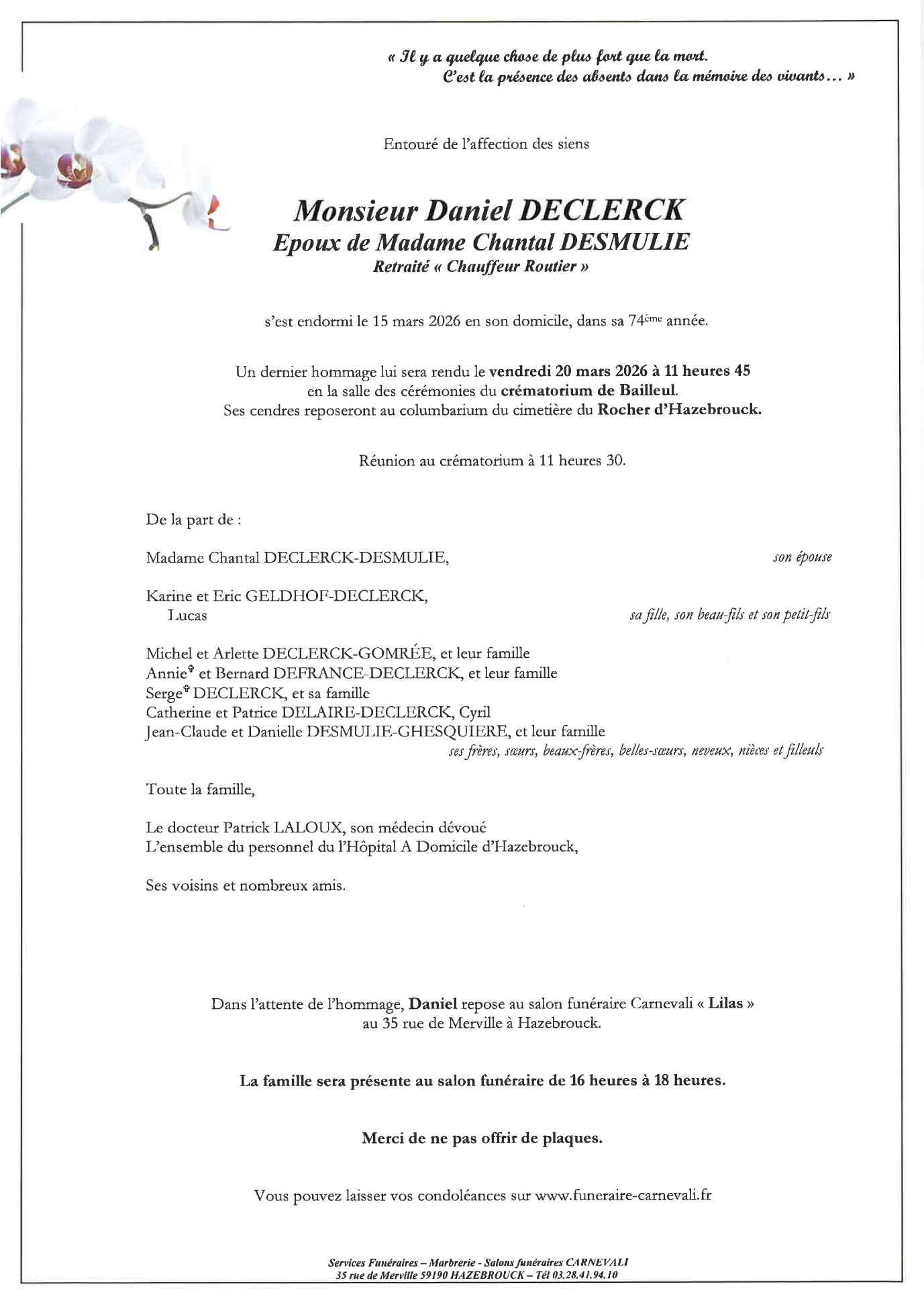 Décédé à Hazebrouck (59190, France) le dimanche 15 mars 2026 à l'âge de 73 ans