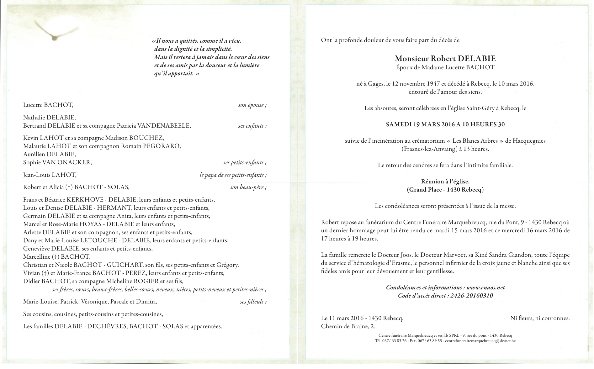 Died in Rebecq (1430) on 10 March 2016 at the age of 68 years