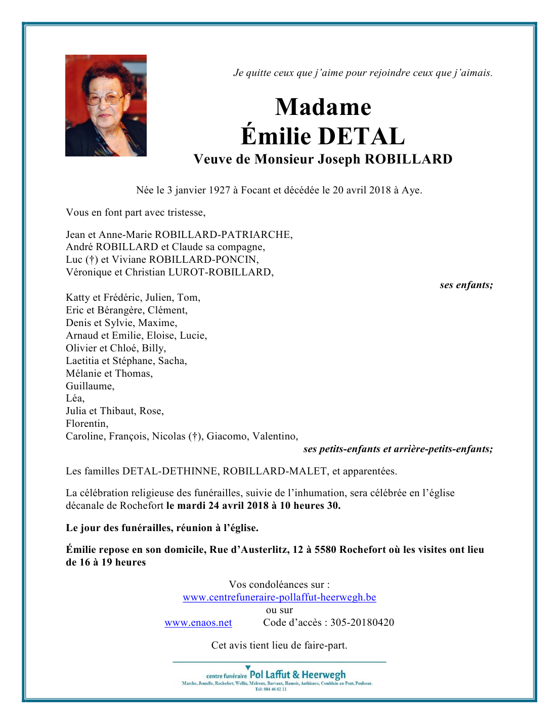 Fallecida en Aye (6900) el viernes, 20 de abril de 2018 a la edad de 91 años