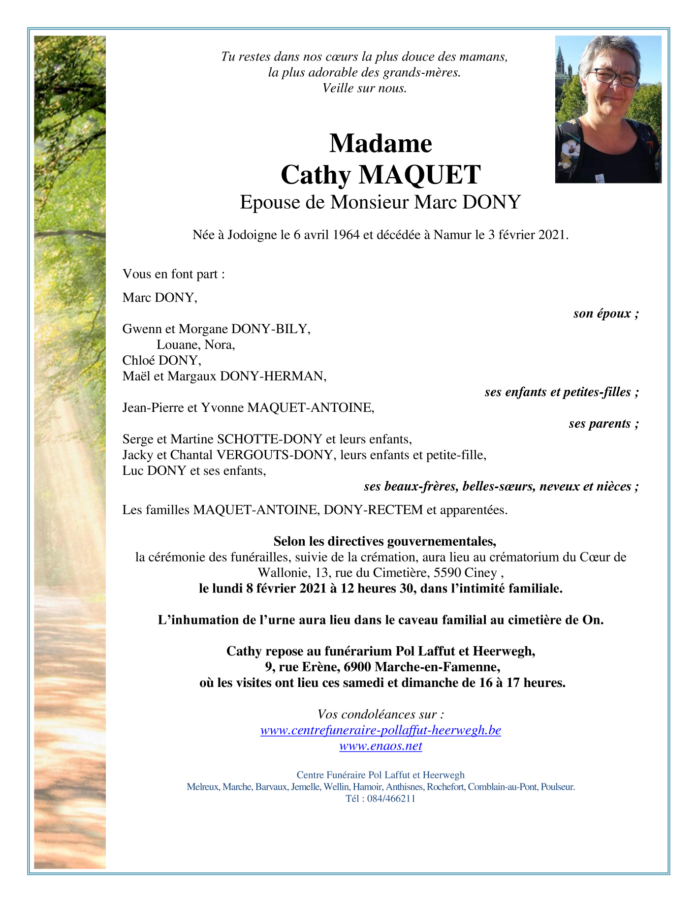 Décédée à Namur (5000) le mercredi 3 février 2021 à l'âge de 56 ans