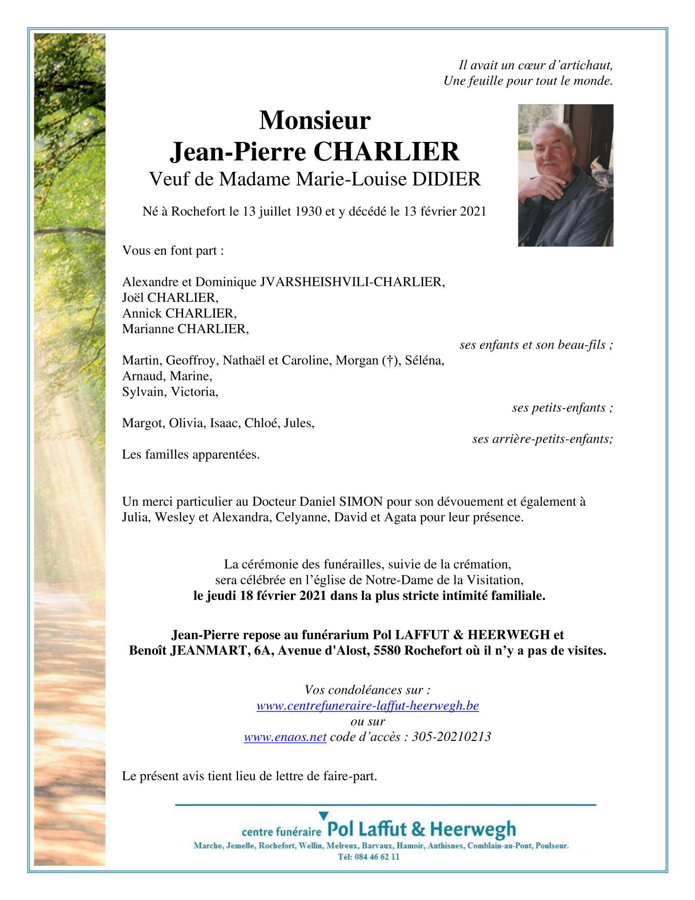 Fallecido en Rochefort (5580) el sábado, 13 de febrero de 2021 a la edad de 90 años