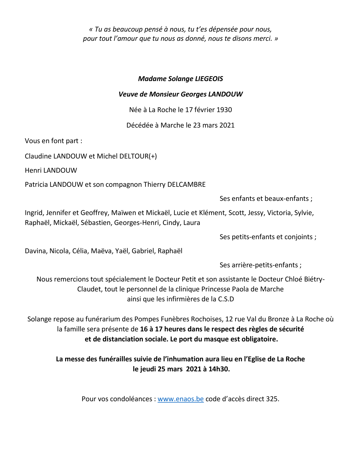 Décédée à Marche-en-Famenne (6900) le mardi 23 mars 2021 à l'âge de 91 ans