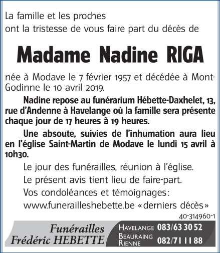 Died in Mont-Godinne (5530) on 10 April 2019 at the age of 62 years