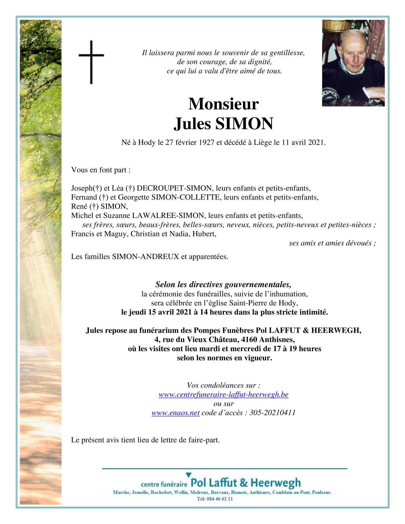 Died in Liège (4000) on 11 April 2021 at the age of 94 years