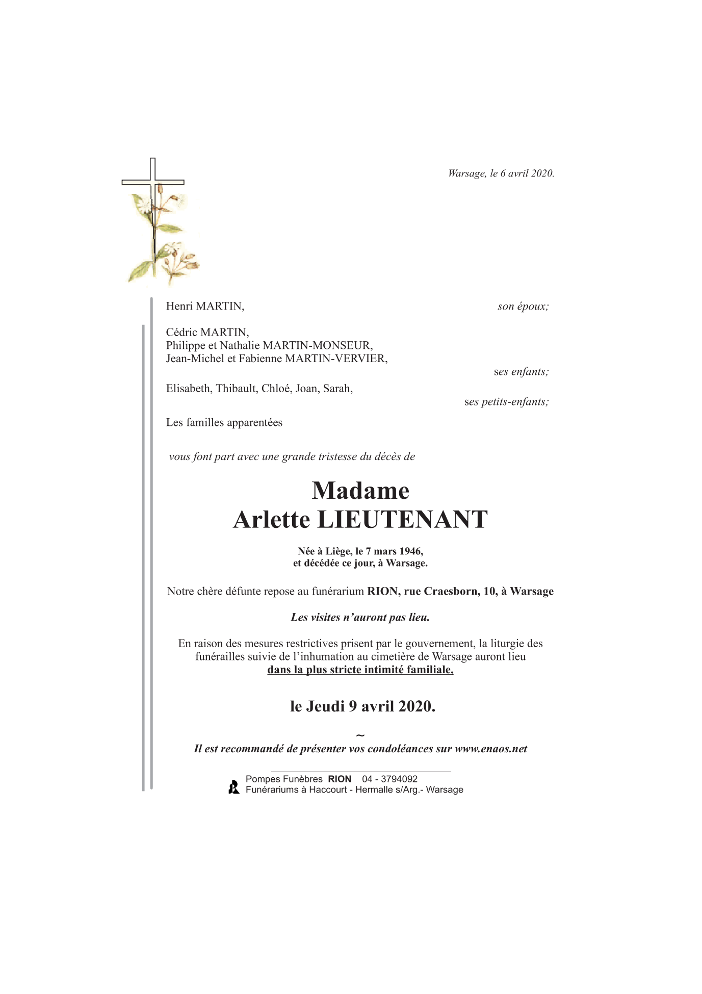 Décédée à Warsage (4608) le lundi 6 avril 2020 à l'âge de 74 ans