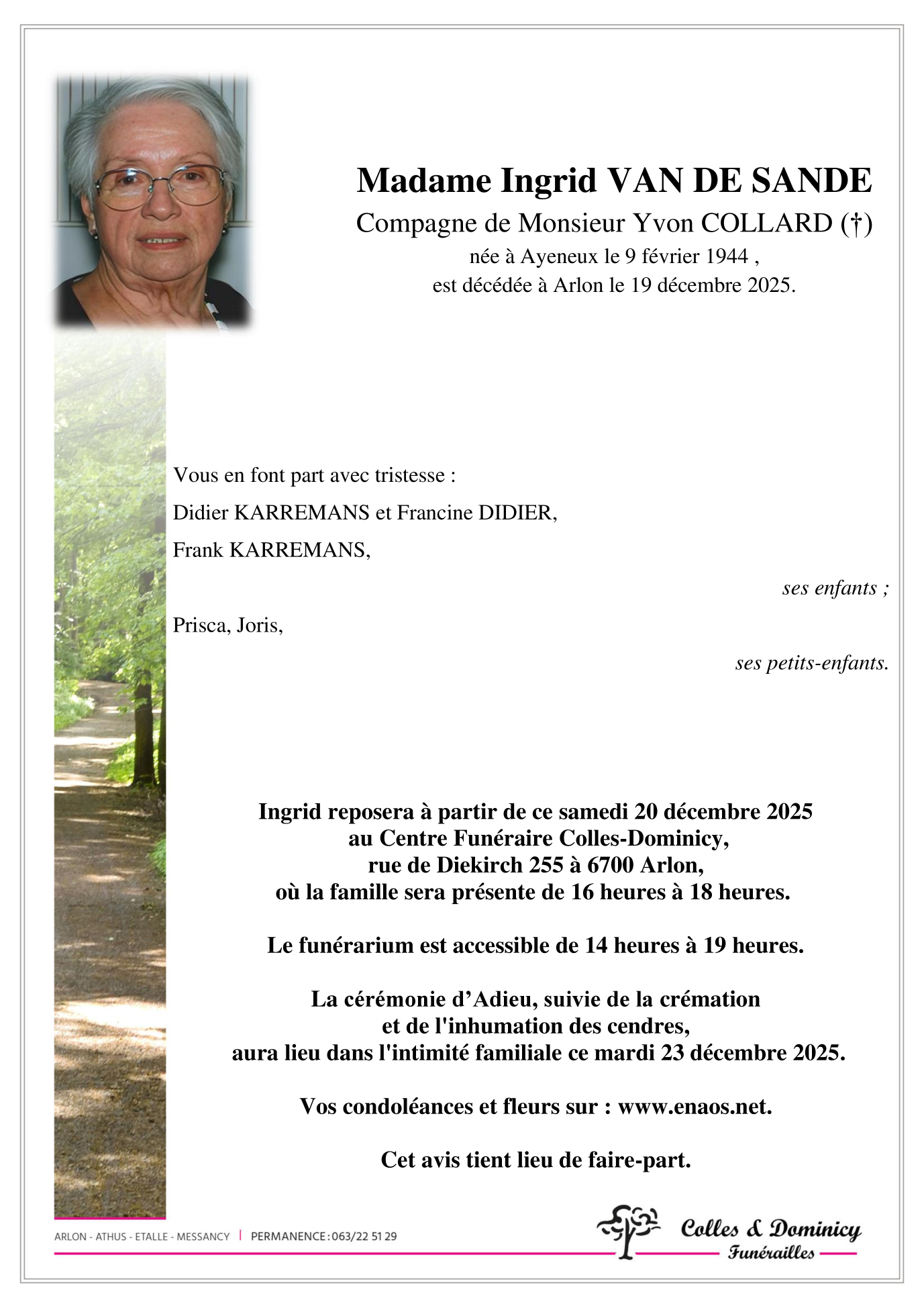 Fallecida en Arlon (6700) el viernes, 19 de diciembre de 2025 a la edad de 81 años