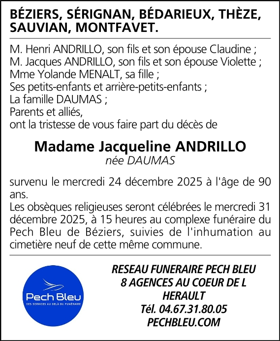 Décédée à Béziers (34500, France) le mercredi 24 décembre 2025 à l'âge de 90 ans