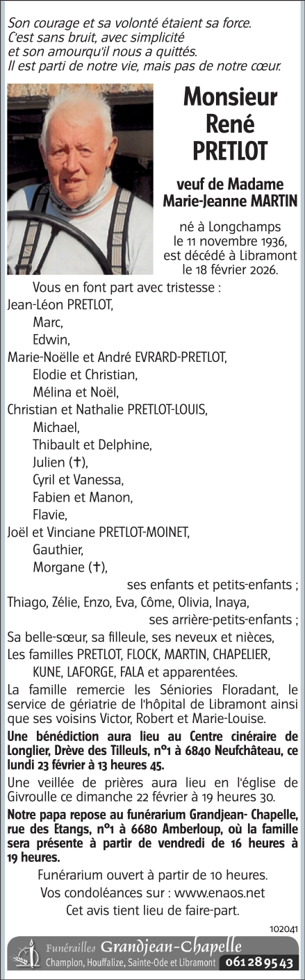 Décédé à Libramont (6800) le mercredi 18 février 2026 à l'âge de 89 ans