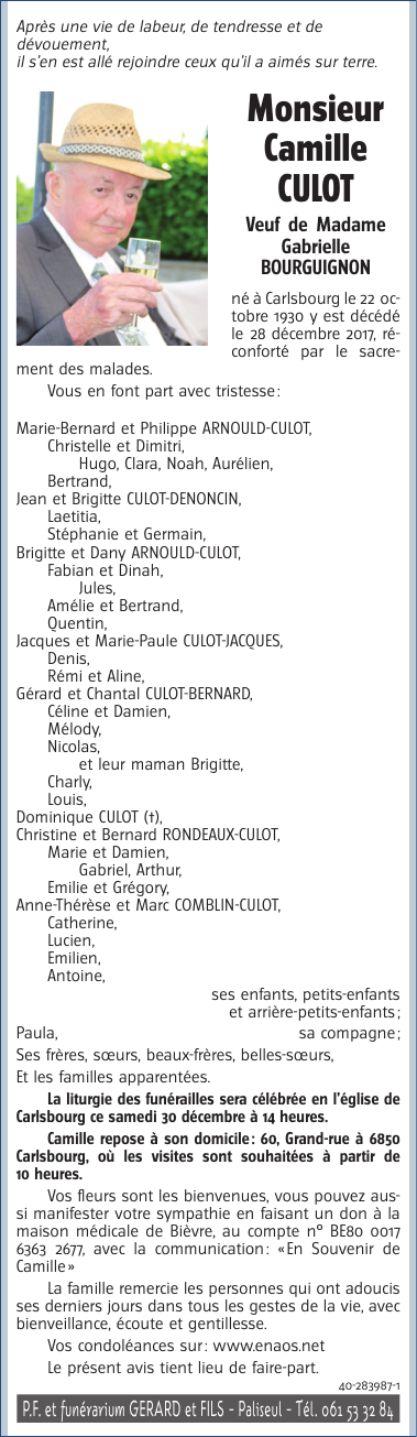 Décédé à Carlsbourg (6850) le jeudi 28 décembre 2017 à l'âge de 87 ans