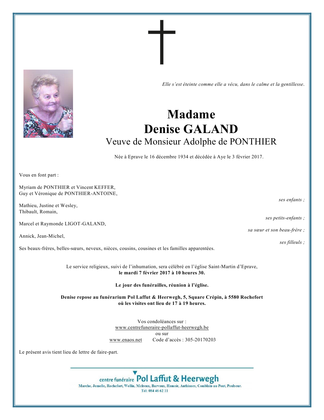 Née à Eprave (5580) le dimanche 16 décembre 1934