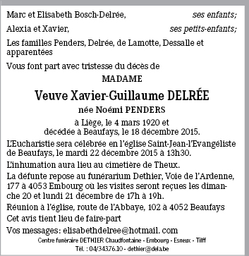 Décédée à Beaufays (4052) le vendredi 18 décembre 2015 à l'âge de 95 ans