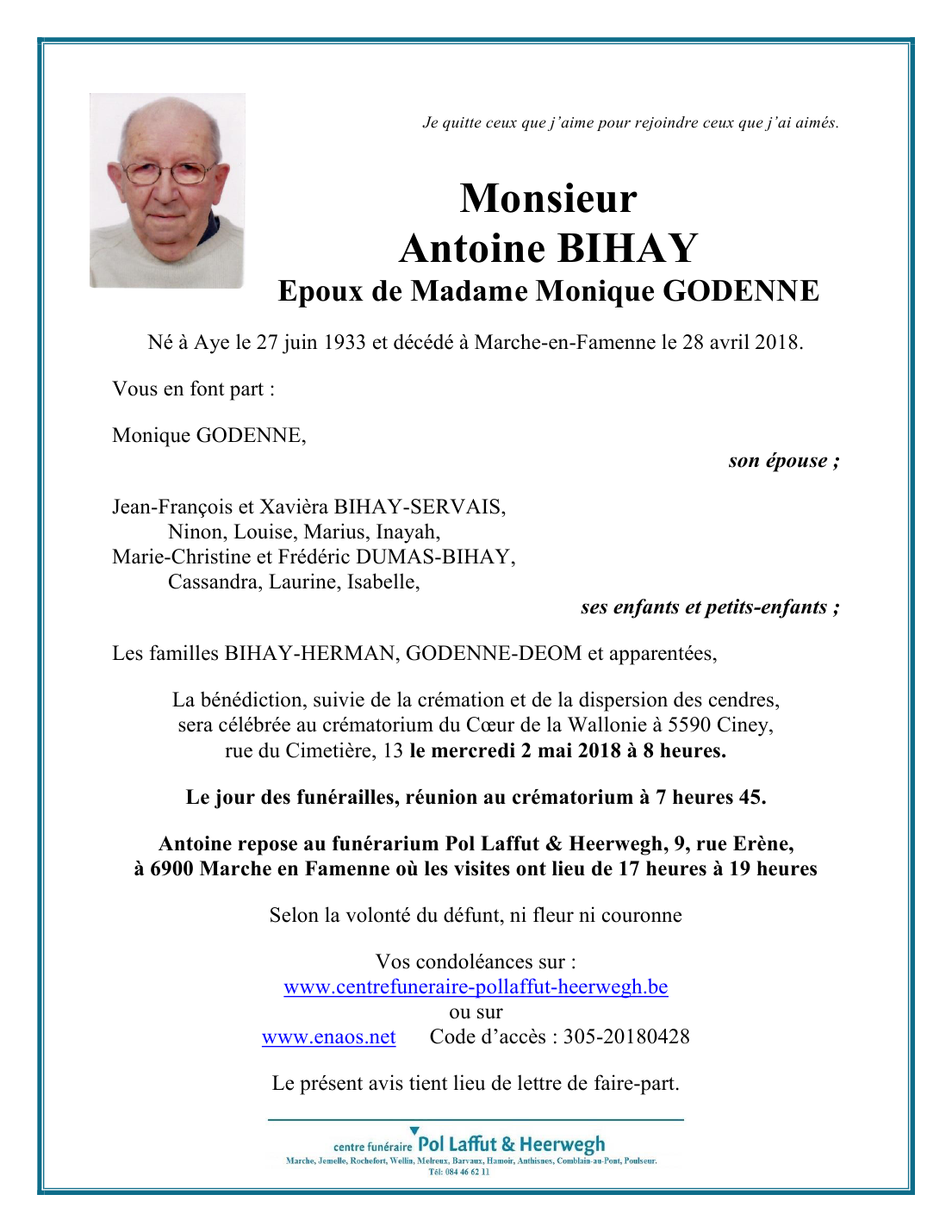 Décédé à Marche-en-Famenne (6900) le samedi 28 avril 2018 à l'âge de 84 ans