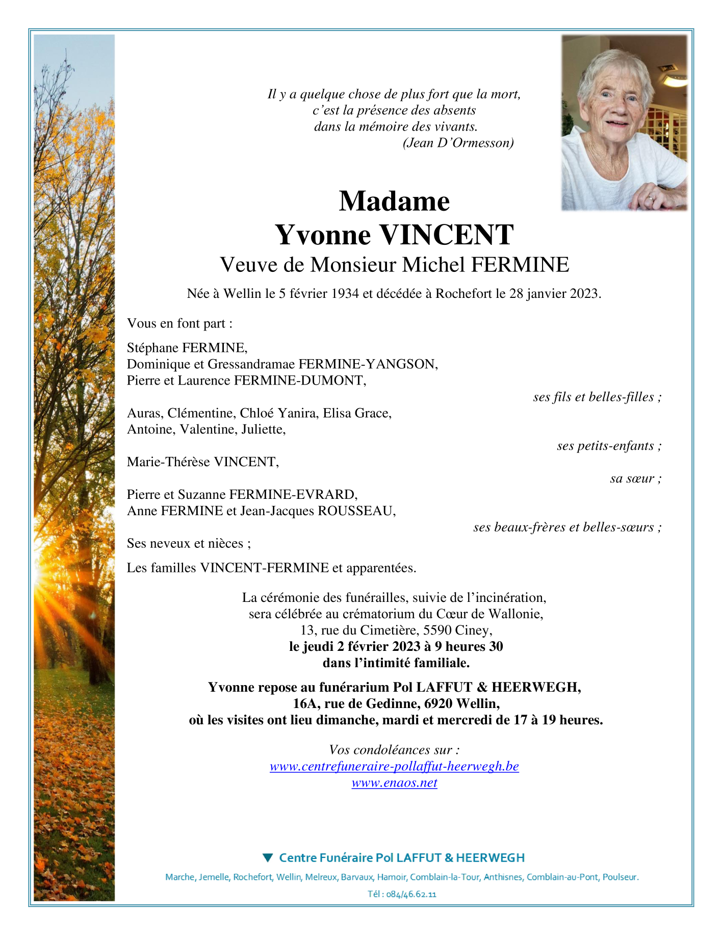 Overleden te Rochefort (5580) op zaterdag 28 januari 2023 op 88-jarige leeftijd