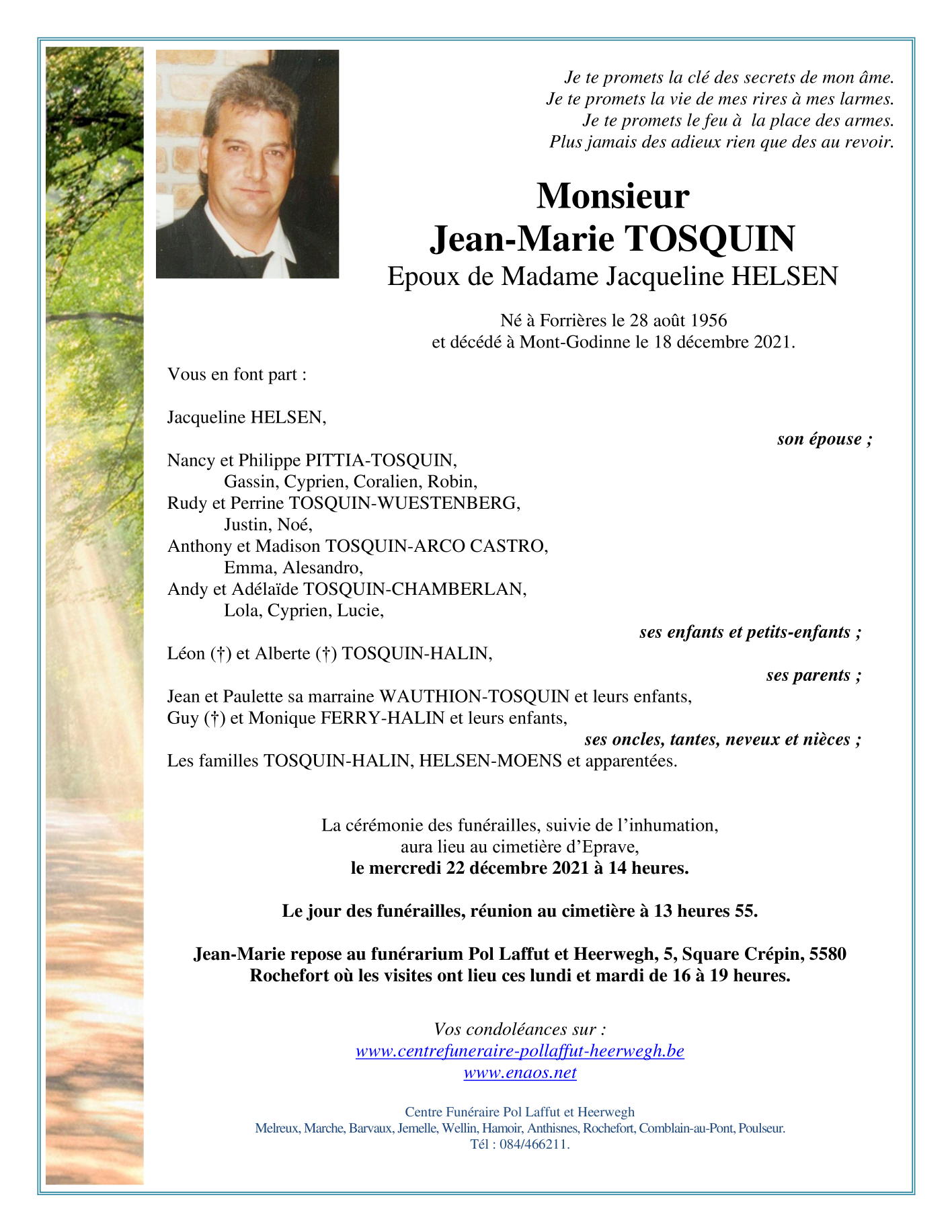 Décédé à Mont-Godinne (5530) le samedi 18 décembre 2021 à l'âge de 65 ans