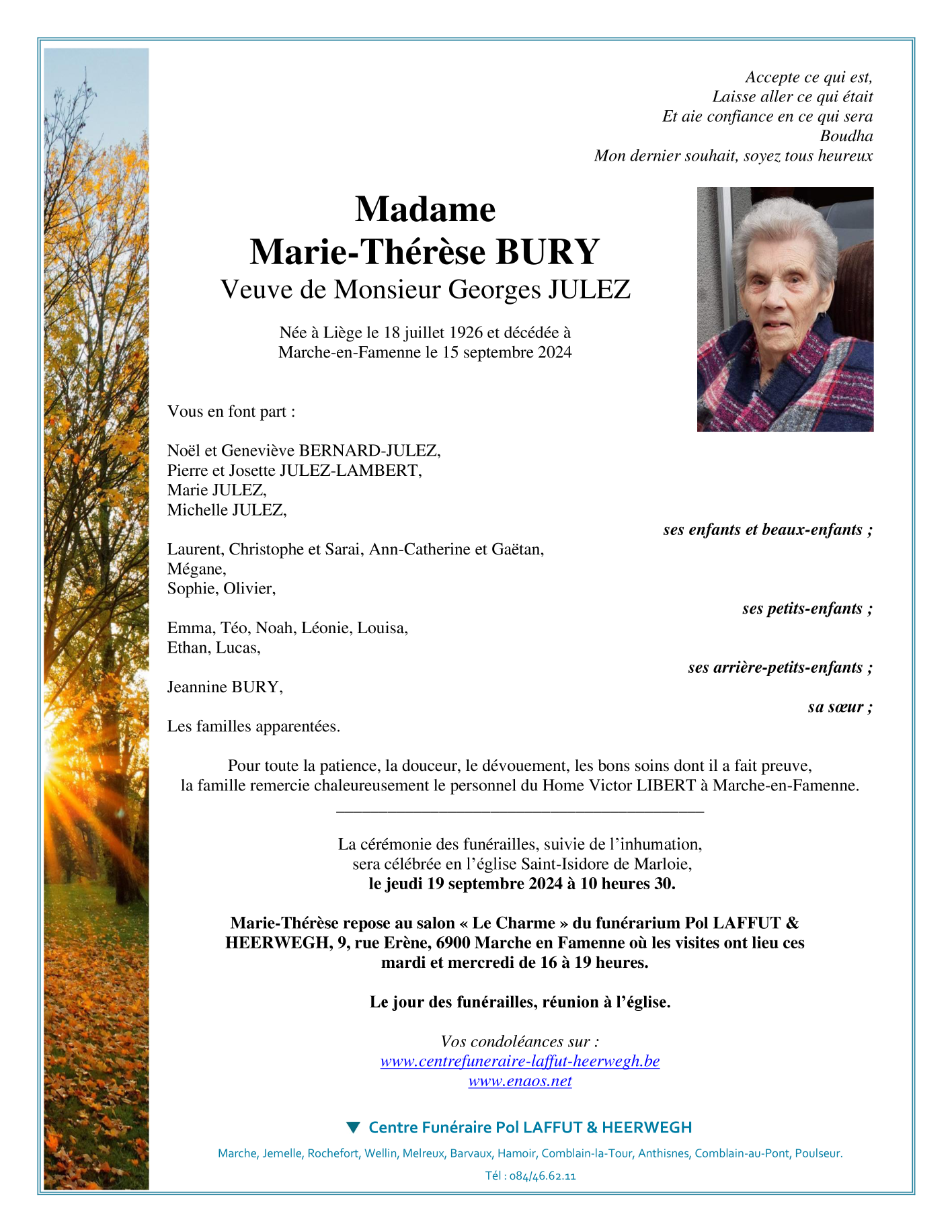 Overleden te Marche-en-Famenne (6900) op zondag 15 september 2024 op 98-jarige leeftijd