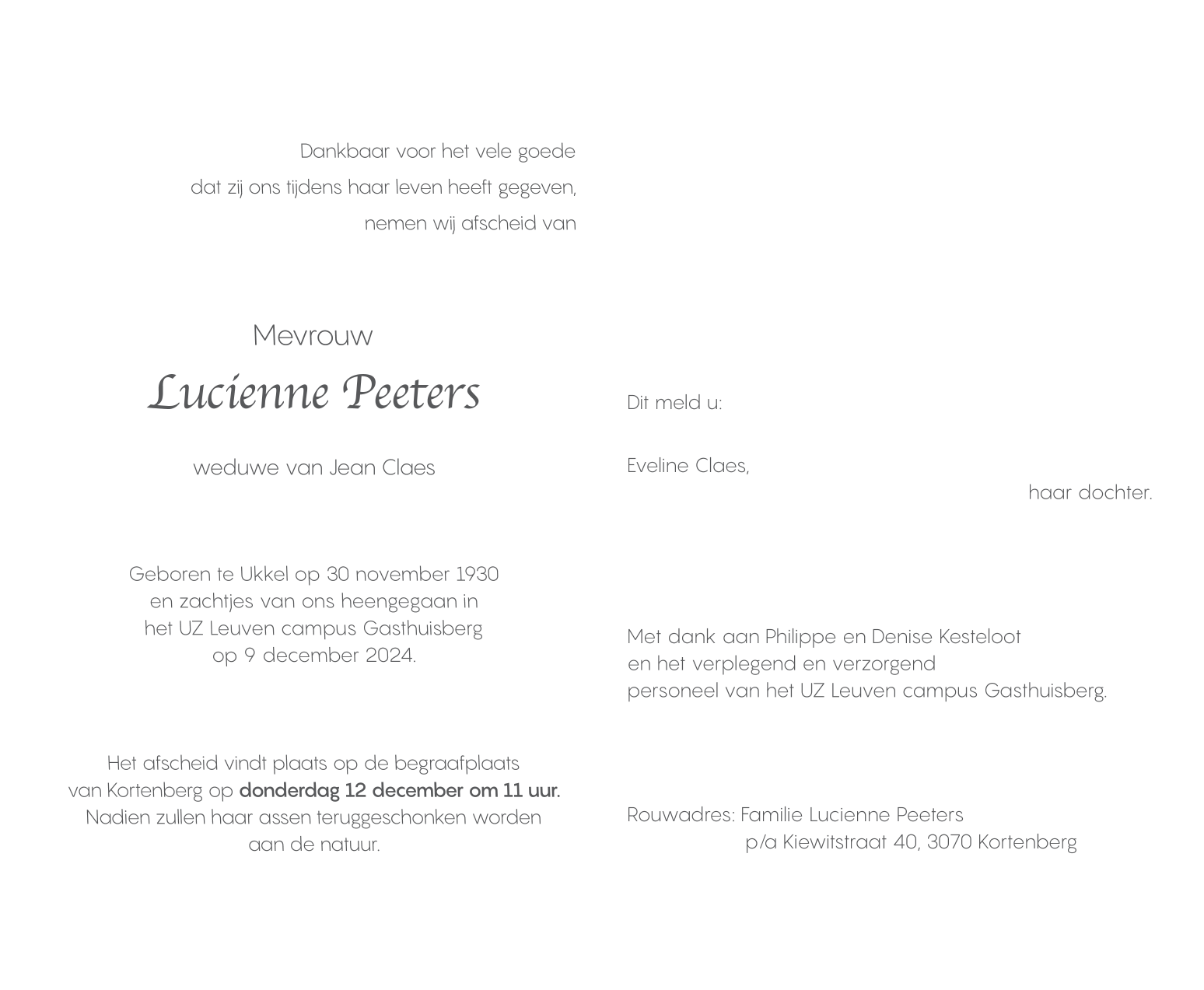 Décédée à Leuven (3000) le lundi 9 décembre 2024 à l'âge de 94 ans