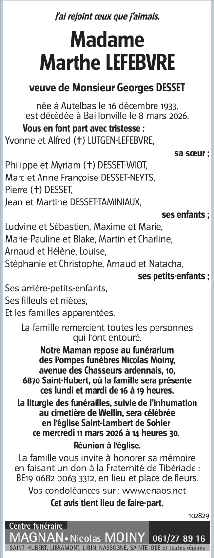 Overleden te Baillonville (5377) op zondag 8 maart 2026 op 92-jarige leeftijd