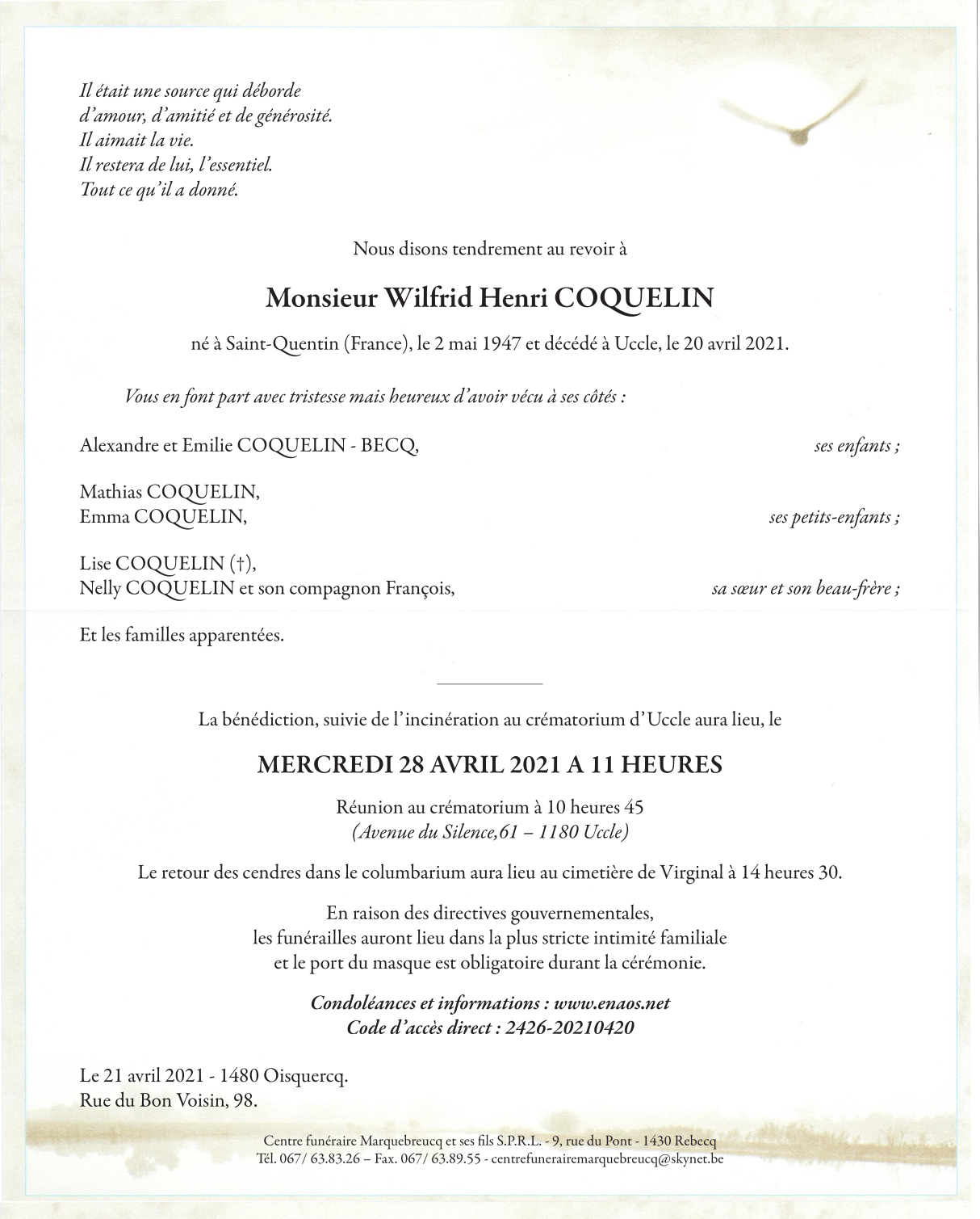 Décédé à Uccle (1180) le mardi 20 avril 2021 à l'âge de 73 ans