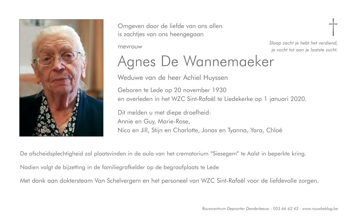 Décédée à Liedekerke (1770) le mercredi 1 janvier 2020 à l'âge de 89 ans