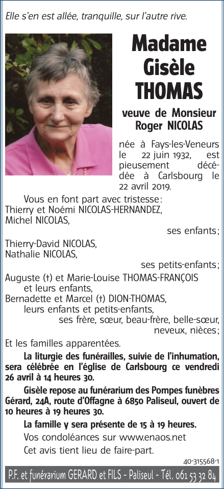 Veuve de Monsieur Roger NICOLAS