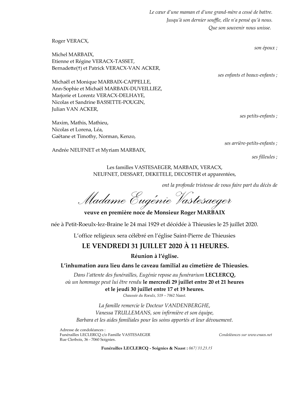 Overleden te Thieusies (7061) op zaterdag 25 juli 2020 op 91-jarige leeftijd
