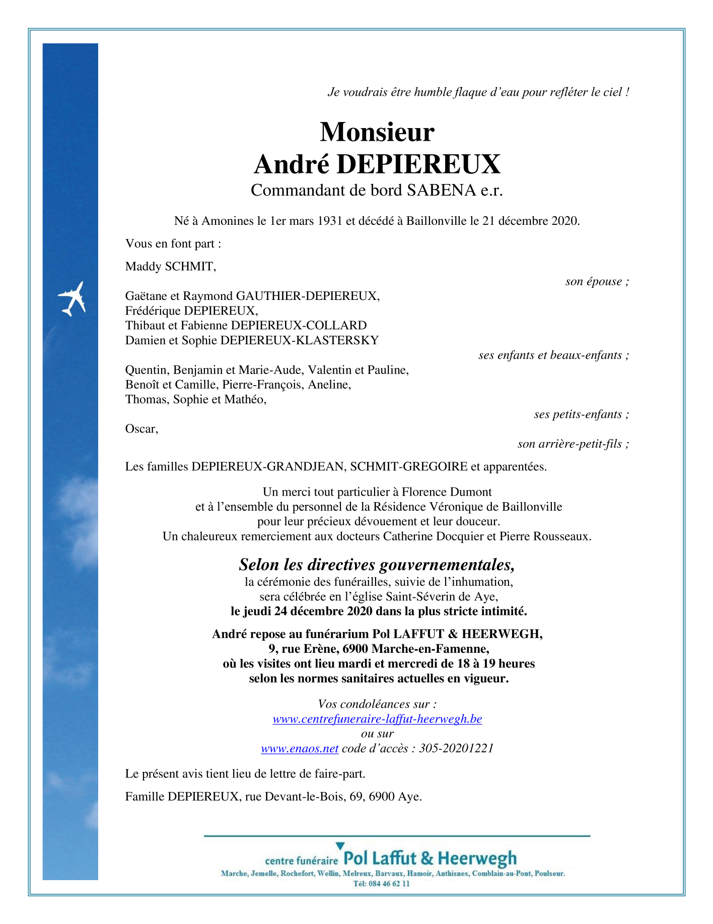 Décédé à Baillonville (5377) le lundi 21 décembre 2020 à l'âge de 89 ans