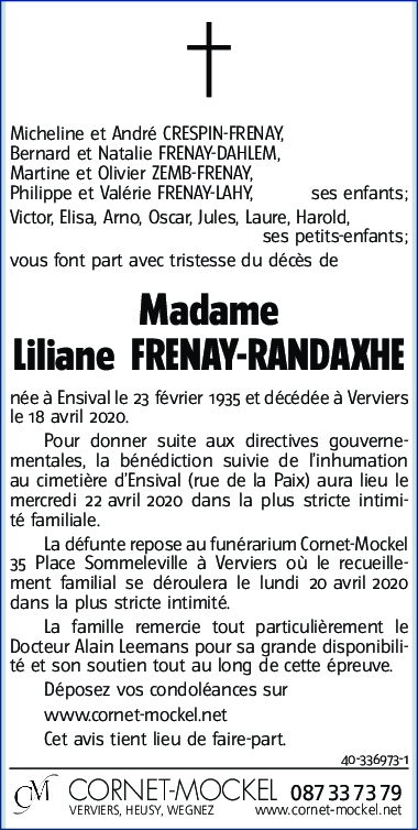 Fallecida en Verviers (4800) el sábado, 18 de abril de 2020 a la edad de 85 años
