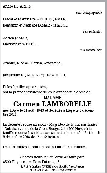 Fallecida en Liège (4000) el viernes, 5 de diciembre de 2014 a la edad de 71 años