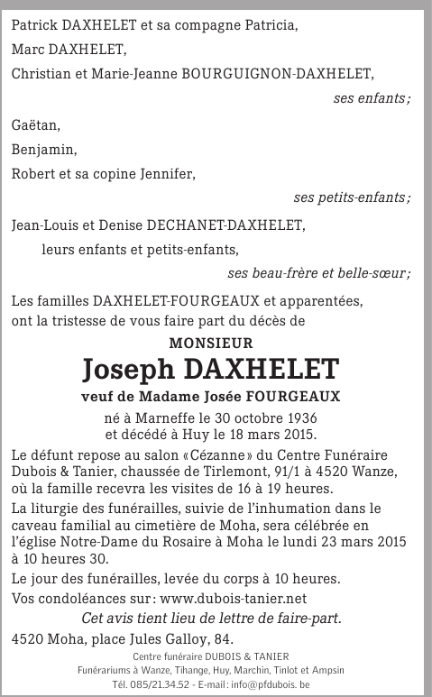 Died in Huy (4500) on 18 March 2015 at the age of 78 years