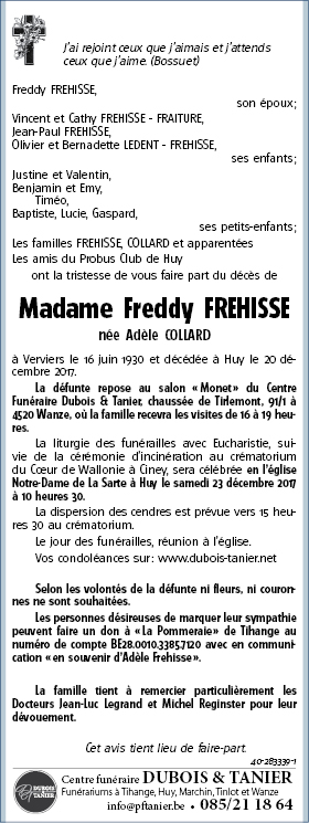 Décédée à Huy (4500) le mercredi 20 décembre 2017 à l'âge de 87 ans