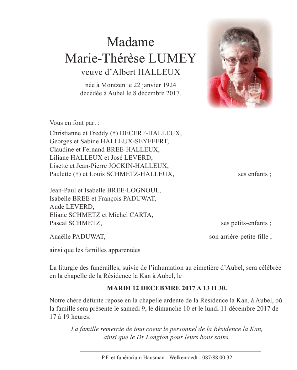 Overleden te Aubel (4880) op vrijdag 8 december 2017 op 93-jarige leeftijd