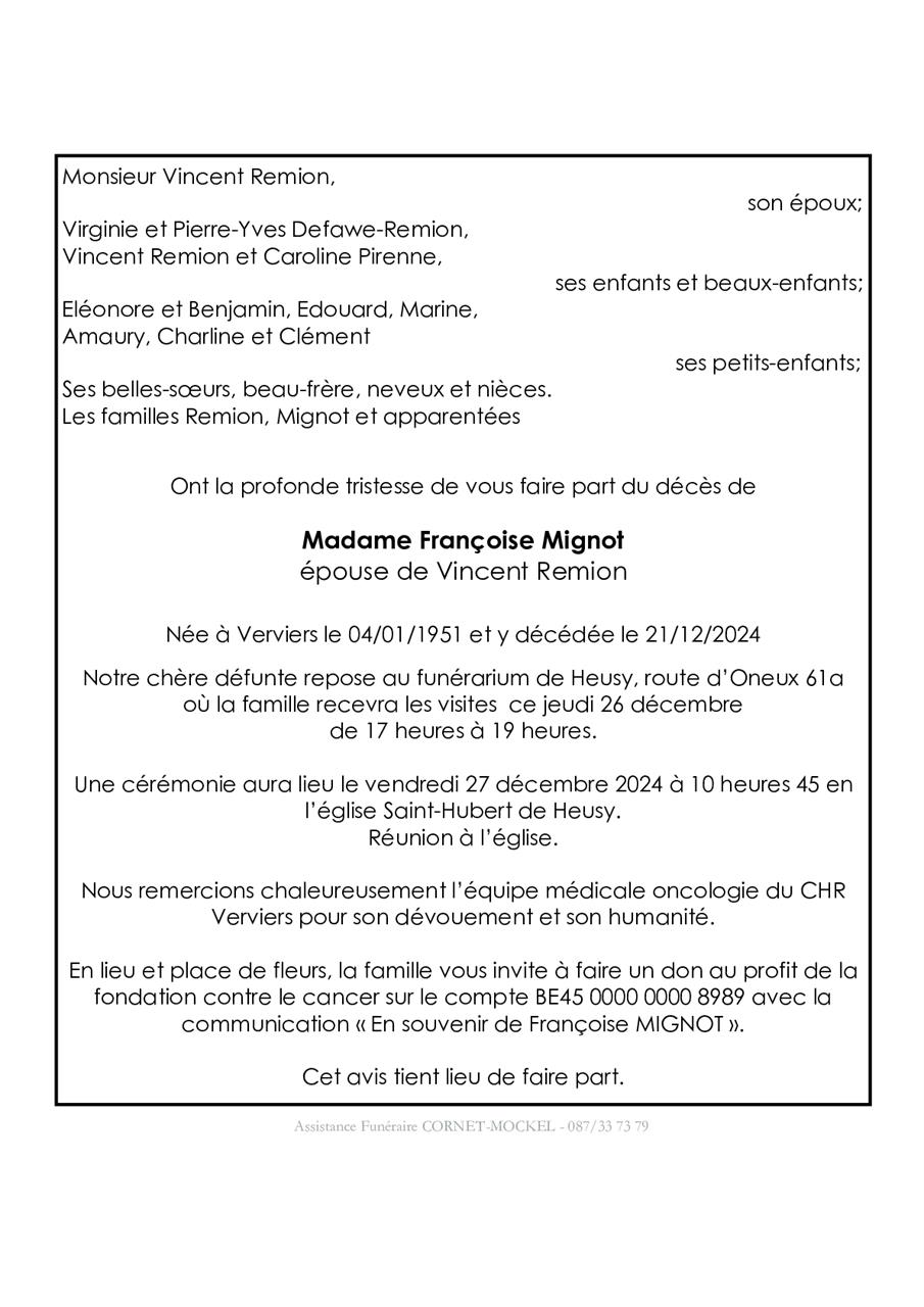 Décédée à Verviers (4800) le samedi 21 décembre 2024 à l'âge de 73 ans
