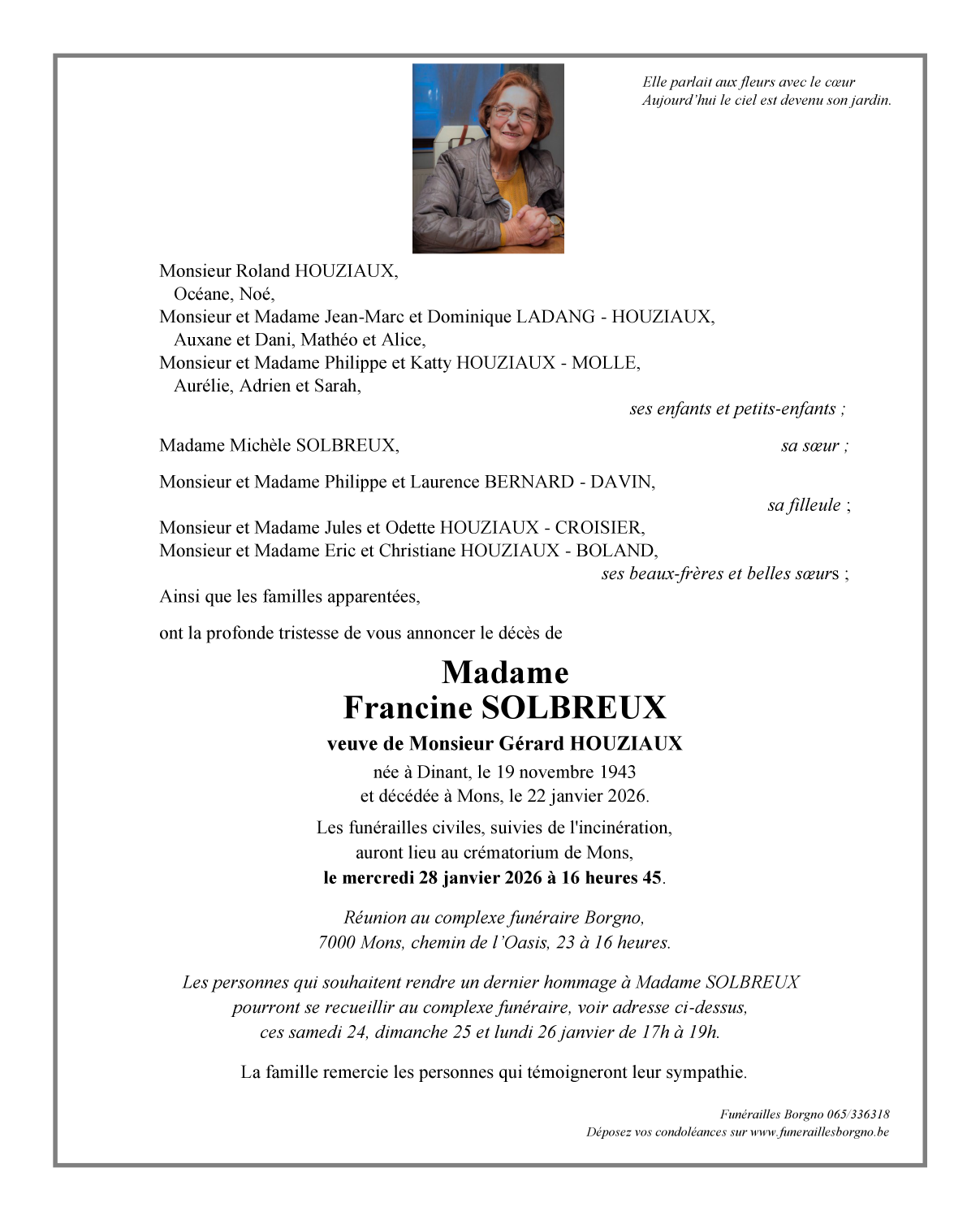 Décédée à Mons (7000) le jeudi 22 janvier 2026 à l'âge de 82 ans