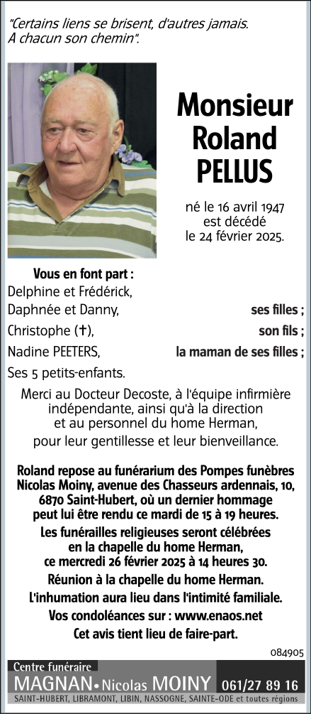 Died in Saint-Hubert (6870) on 24 February 2025 at the age of 77 years