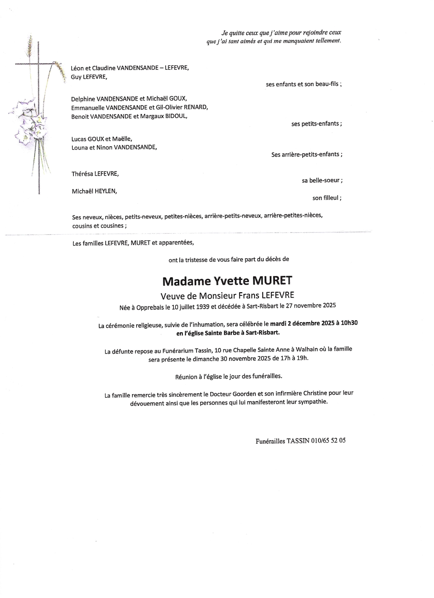 Décédée à Sart-Risbart (1315) le jeudi 27 novembre 2025 à l'âge de 86 ans