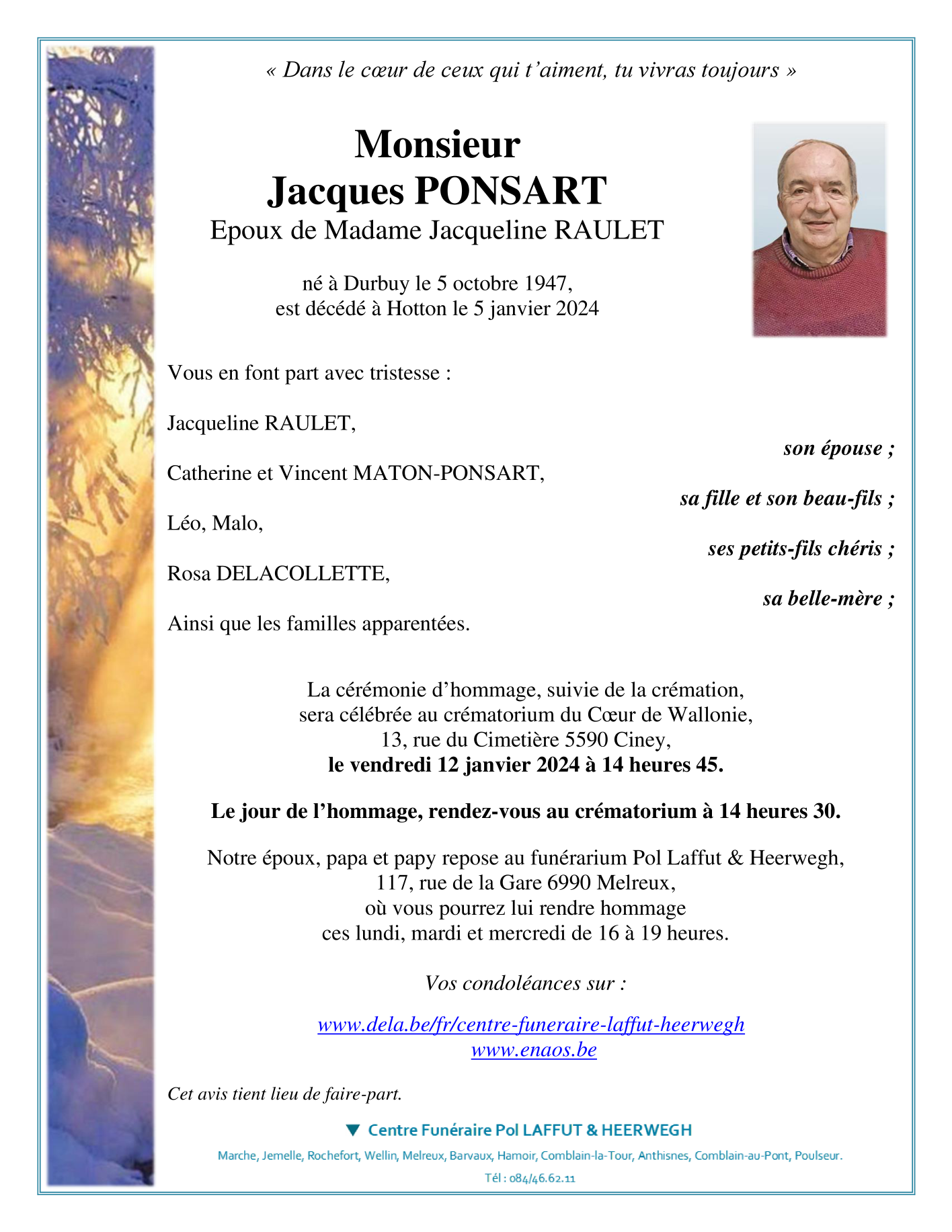 Décédé à Hotton (6990) le vendredi 5 janvier 2024 à l'âge de 76 ans