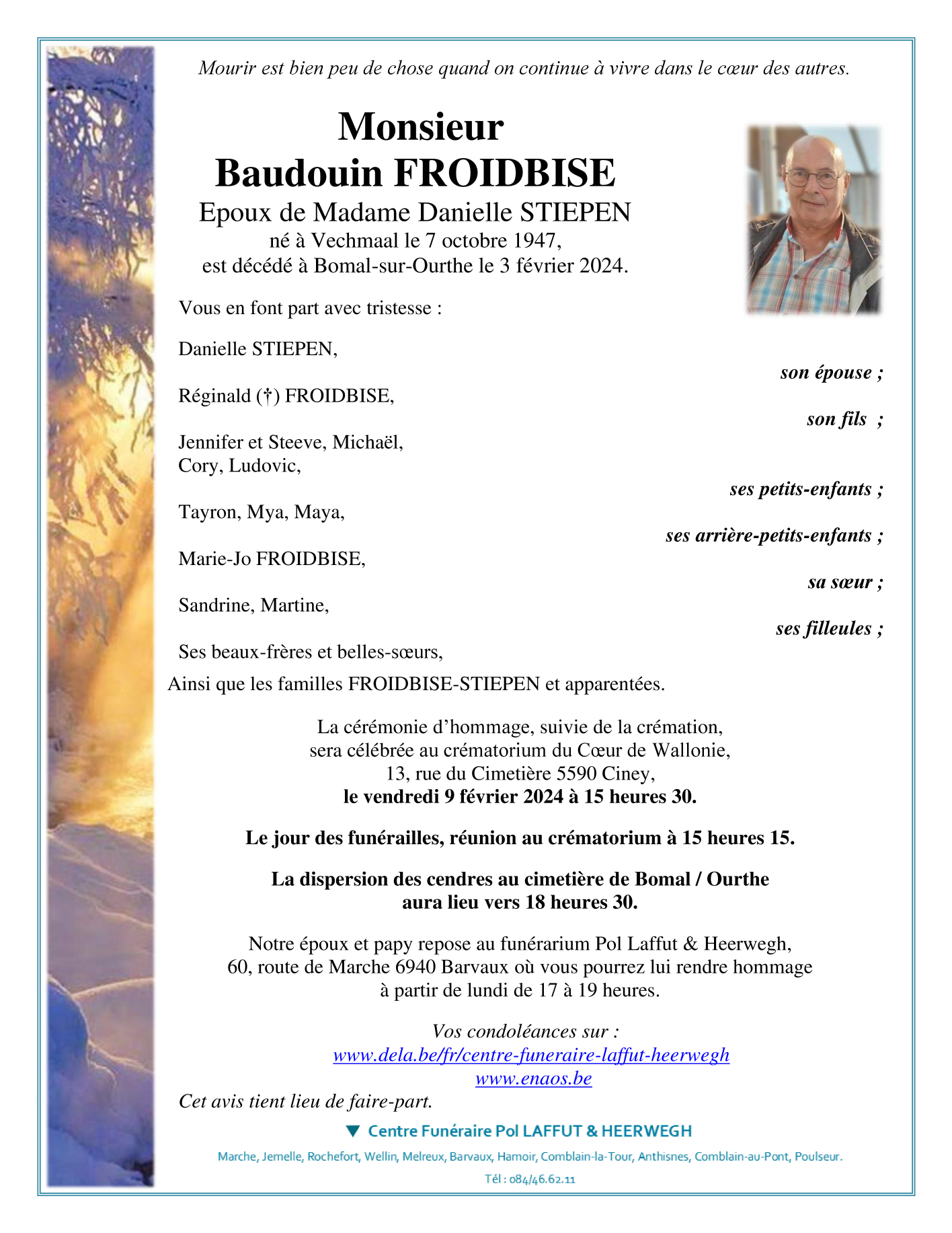 Décédé à Bomal-sur-Ourthe (6941) le samedi 3 février 2024 à l'âge de 76 ans