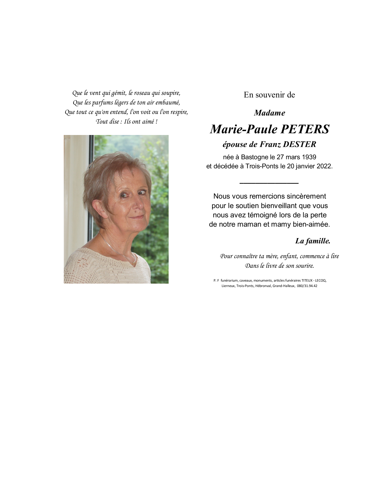 Décédée à Trois-Ponts (4980) le jeudi 20 janvier 2022 à l'âge de 82 ans