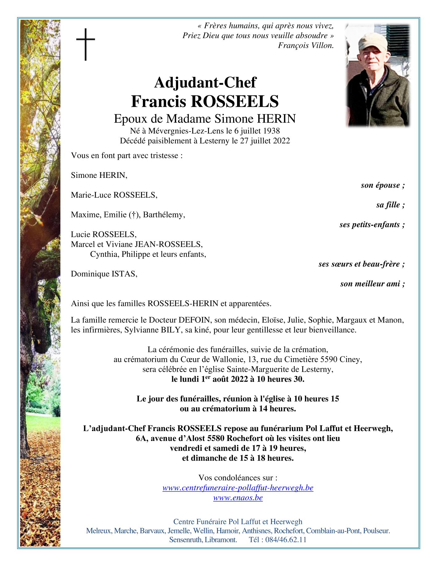 Décédé à Lesterny (6953) le mercredi 27 juillet 2022 à l'âge de 84 ans