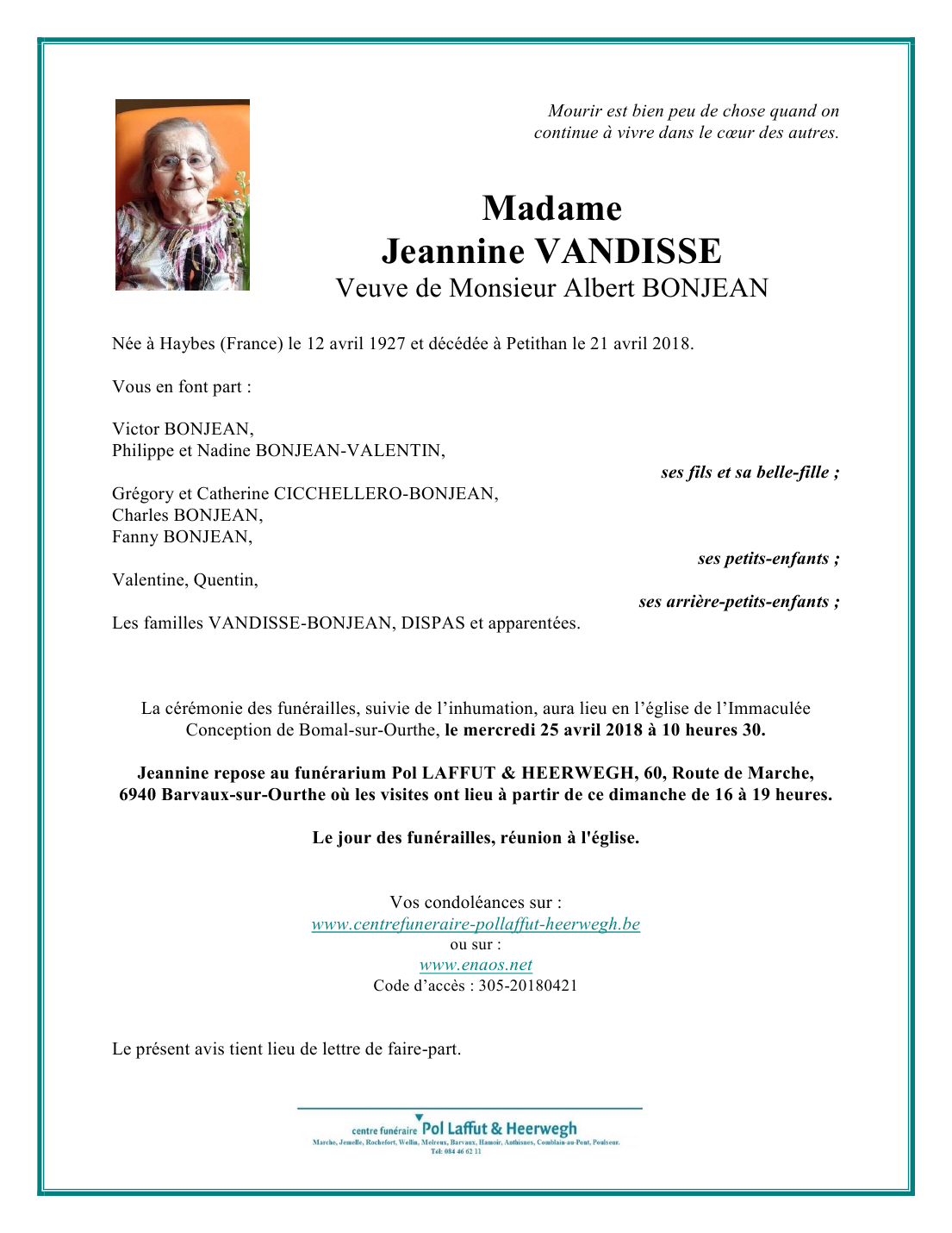 Décédée à Petit-Han (6940) le samedi 21 avril 2018 à l'âge de 91 ans
