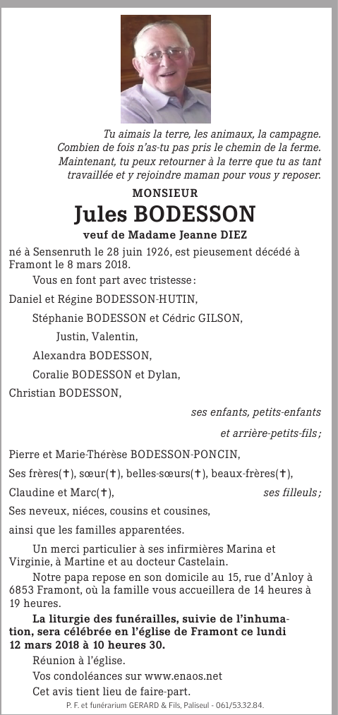 Overleden te Framont (6853) op donderdag 8 maart 2018 op 91-jarige leeftijd