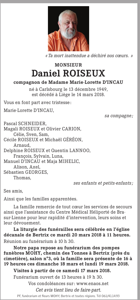 Fallecido en Liège (4000) el miércoles, 14 de marzo de 2018 a la edad de 68 años