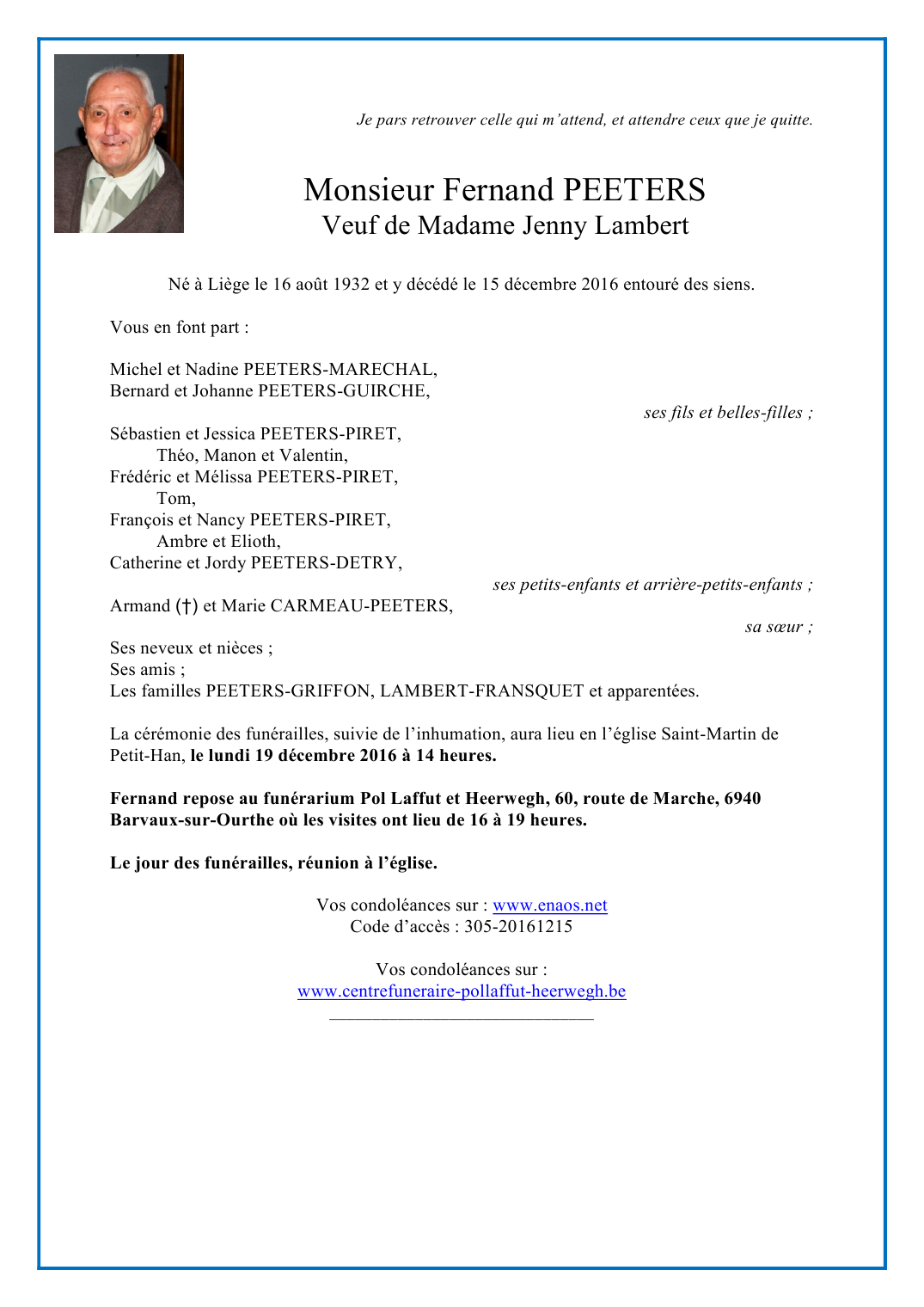 Décédé à Liège (4000) le jeudi 15 décembre 2016 à l'âge de 84 ans